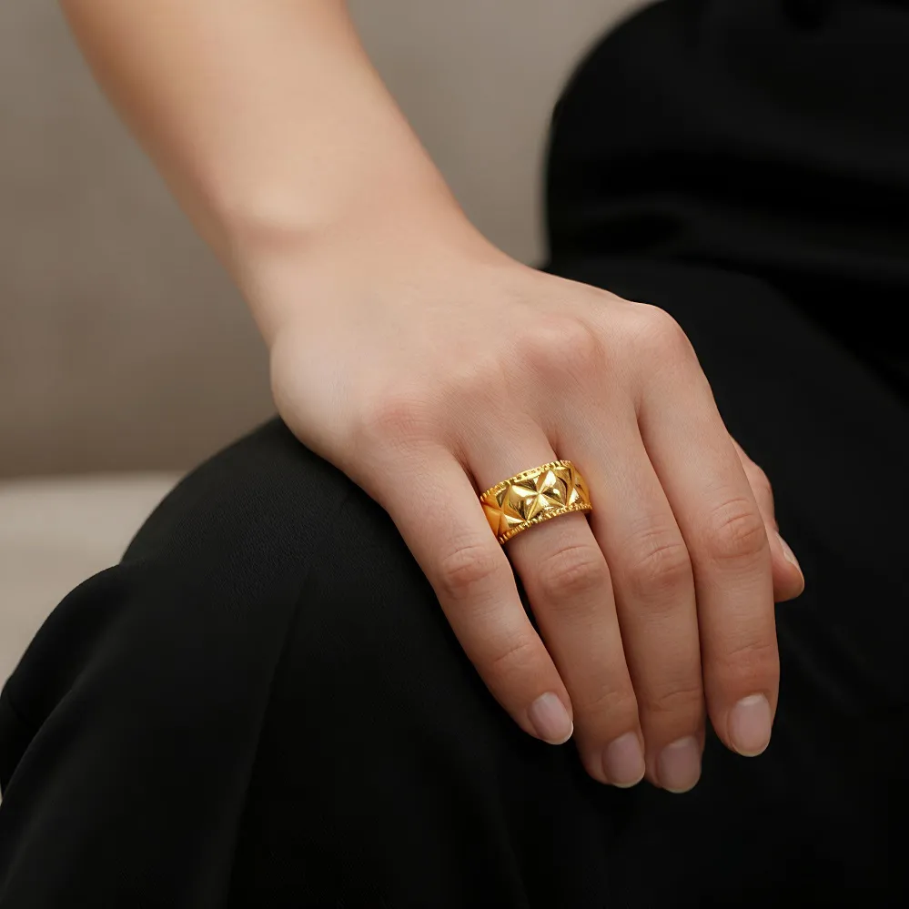 Κατασκευασμένο από υψηλής ποιότητας ανοξείδωτο ατσάλι σε χρυσό χρώμα, αυτό το δαχτυλίδι είναι σχεδιασμένο για να αντέχει στον χρόνο.