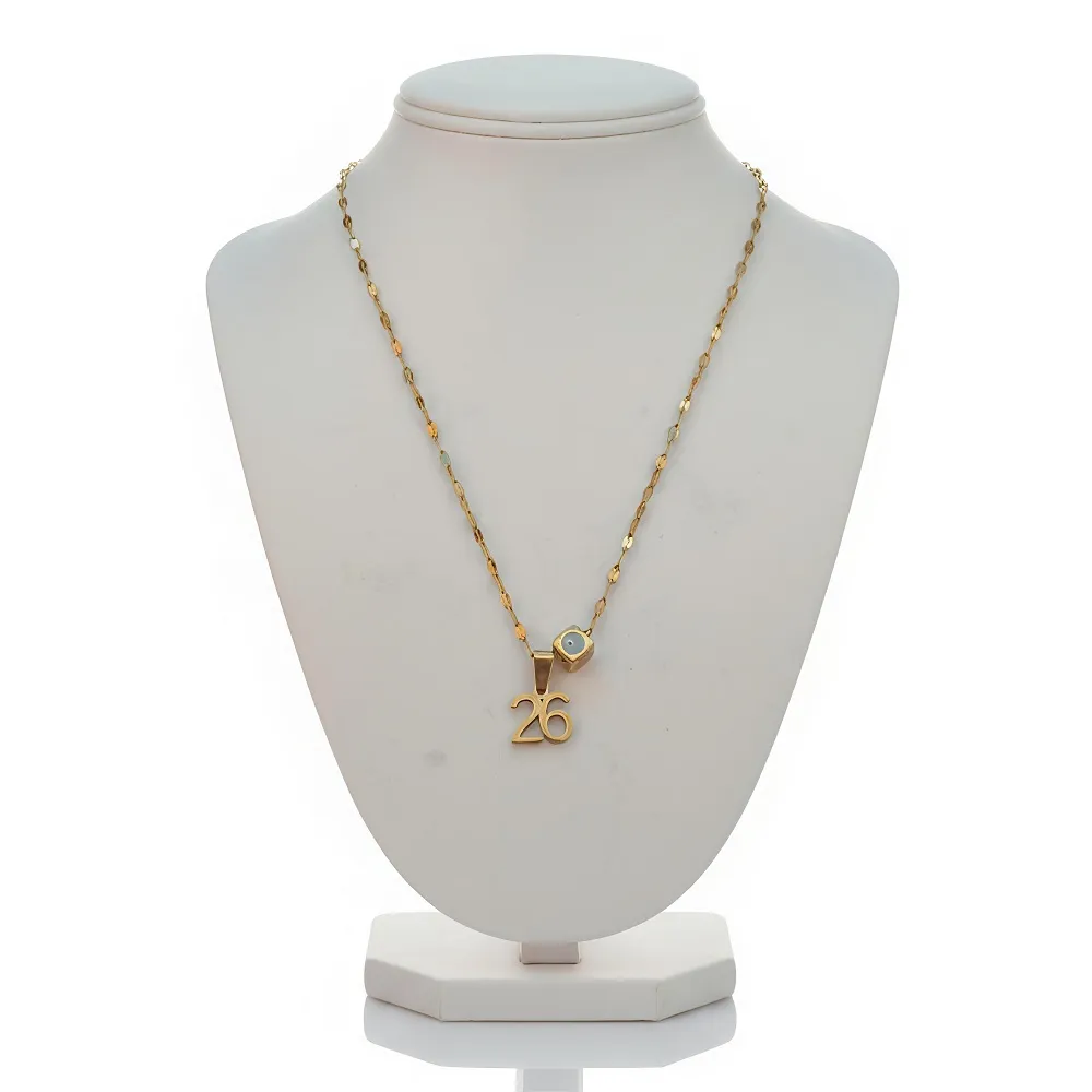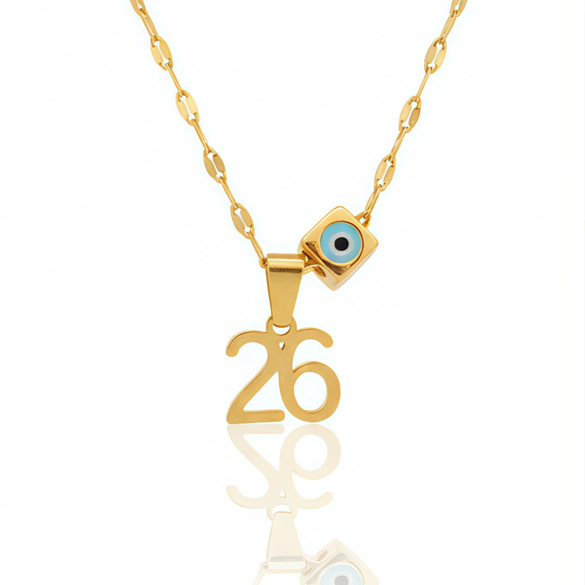 Η αλυσίδα διαθέτει μια τετράγωνη χάντρα από ατσάλι με ένα έντονο μπλε μάτι περασμένο, γνωστό παραδοσιακά για την ικανότητά του να αποτρέπει το κακό μάτι και την αρνητική ενέργεια.