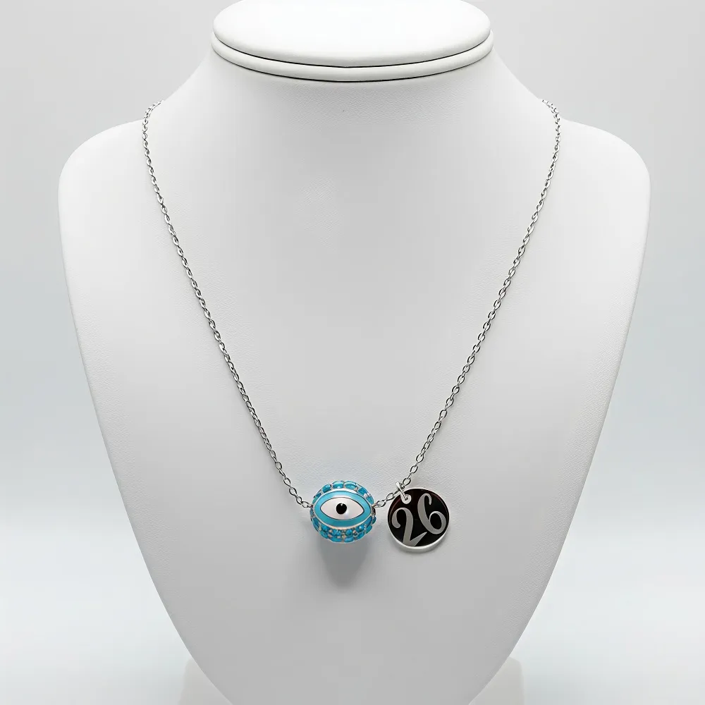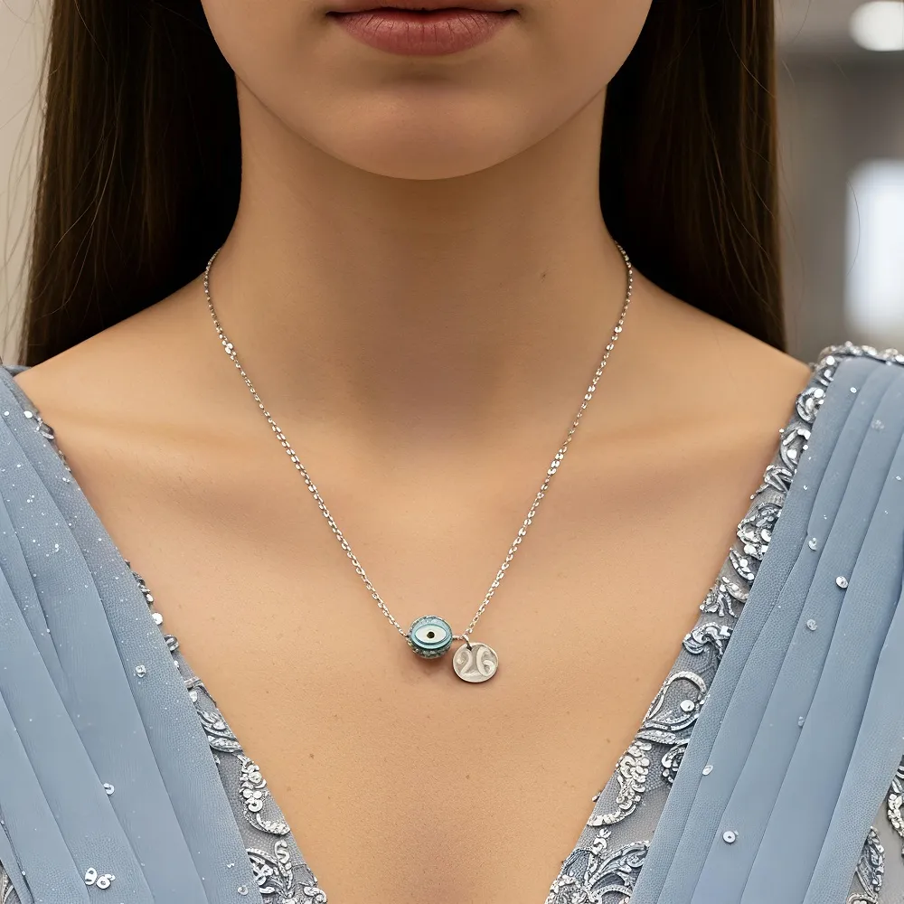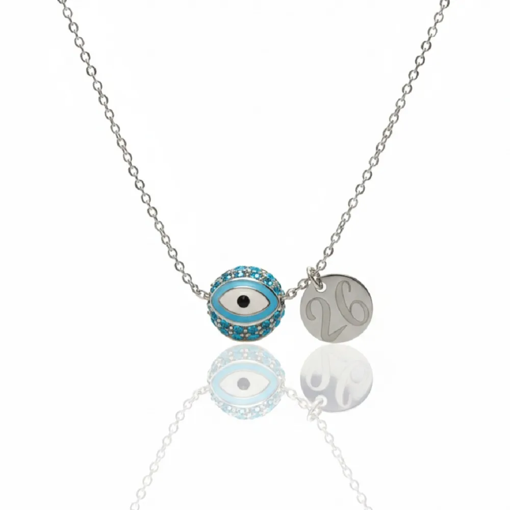 Το κεντρικό στοιχείο είναι ένα γοητευτικό ματάκι σε έντονο θαλασσί χρώμα, το οποίο είναι επιμελημένο με σμάλτο για πλούσια υφή και λάμψη. Περιμετρικά, το ματάκι κοσμείται από αστραφτερά γαλάζια zircon, που προσθέτουν μια διακριτική λάμψη.