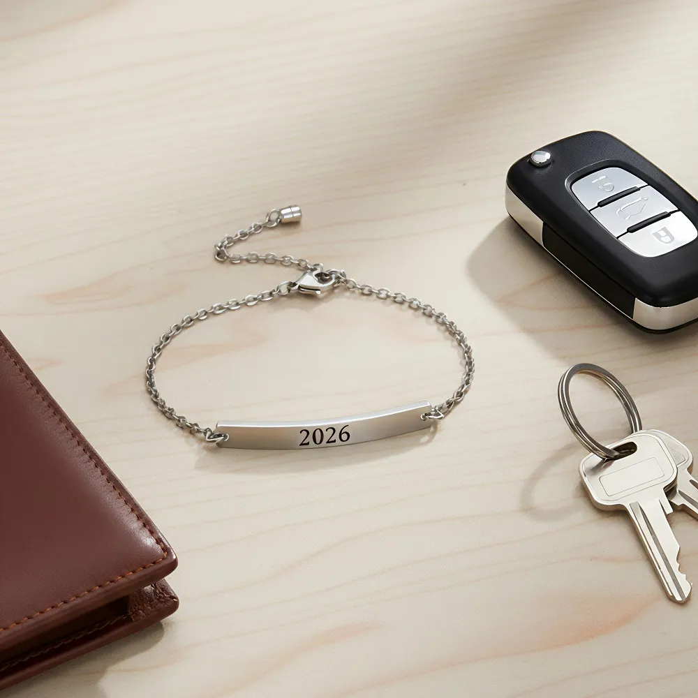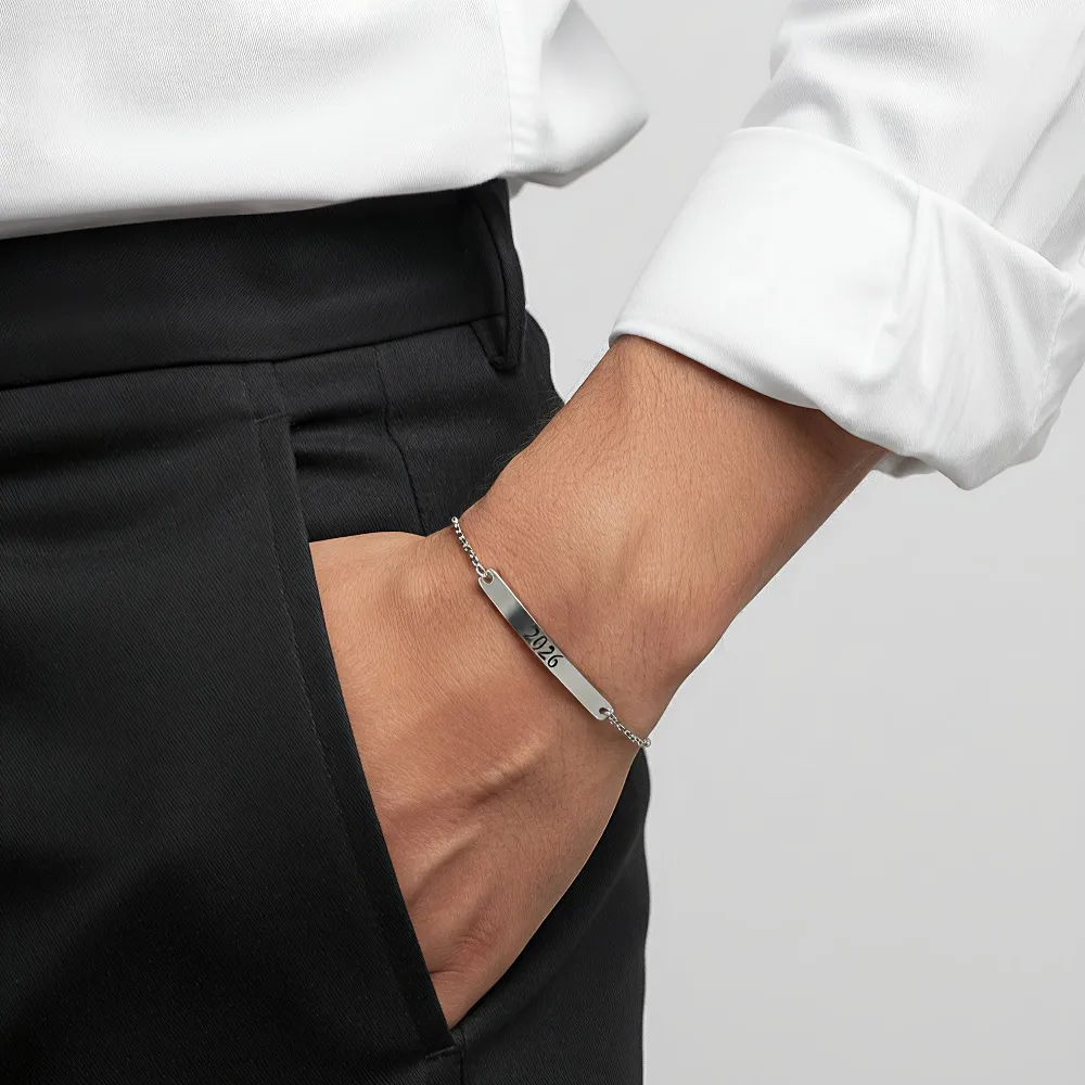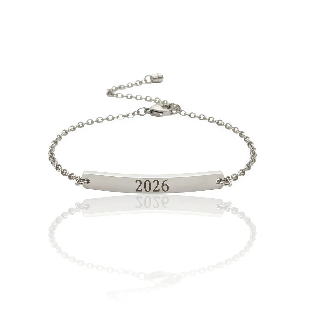 Αυτό το βραχιόλι συνδυάζει την κομψότητα ενός διακριτικού κοσμήματος με τον συμβολισμό ενός γουριού. Στο κέντρο δεσπόζει η χαραγμένη χρονολογία «2026» σε μια μίνιμαλ, καμπυλωτή πλακέτα από γυαλιστερό ανοξείδωτο ατσάλι.