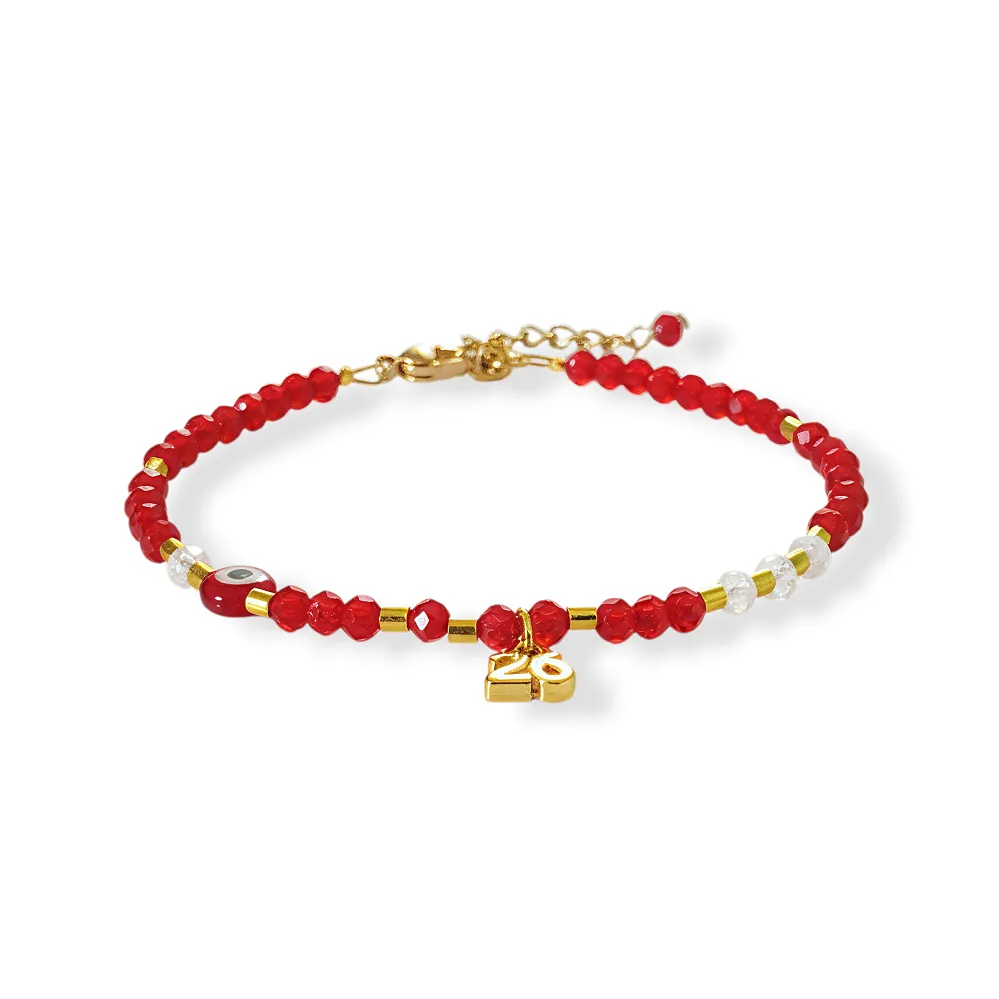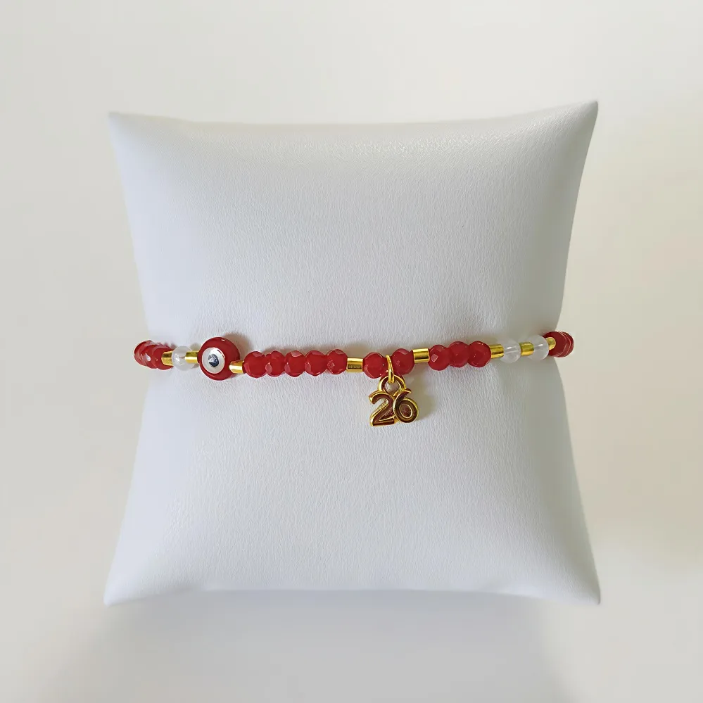 Η λεπτή, χειροποίητη κατασκευή αγκαλιάζει τον καρπό σας με διακριτική λάμψη. Κάθε βραχιόλι διαθέτει ένα εντυπωσιακό γούρι με τον αριθμό "26" και ένα προστατευτικό ματάκι, συνδυάζοντας την κομψότητα με τη σημασία.
