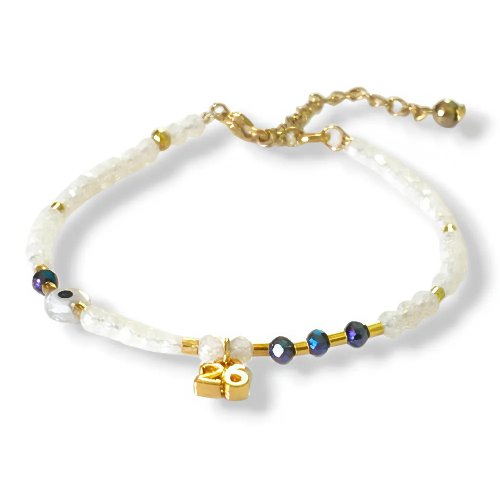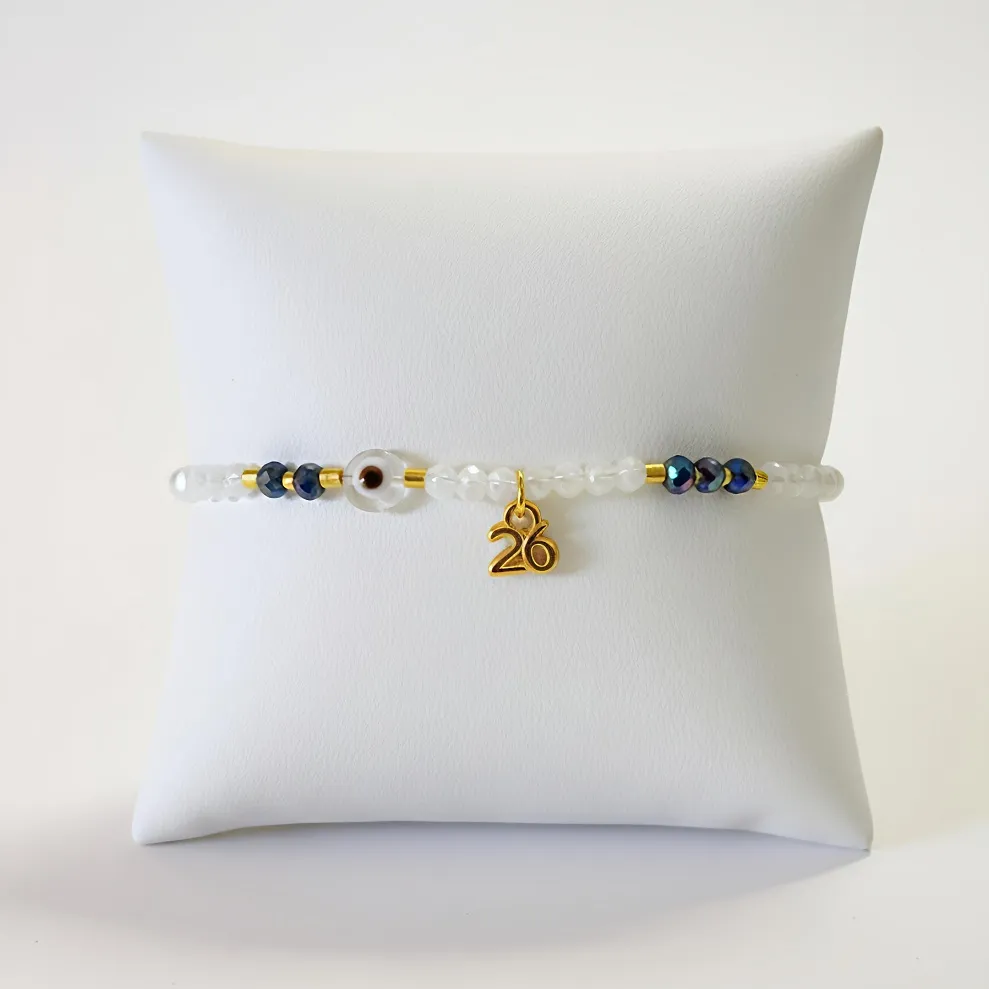 Η λεπτή, χειροποίητη κατασκευή αγκαλιάζει τον καρπό σας με διακριτική λάμψη. Κάθε βραχιόλι διαθέτει ένα εντυπωσιακό γούρι με τον αριθμό "26" και ένα προστατευτικό ματάκι, συνδυάζοντας την κομψότητα με τη σημασία.