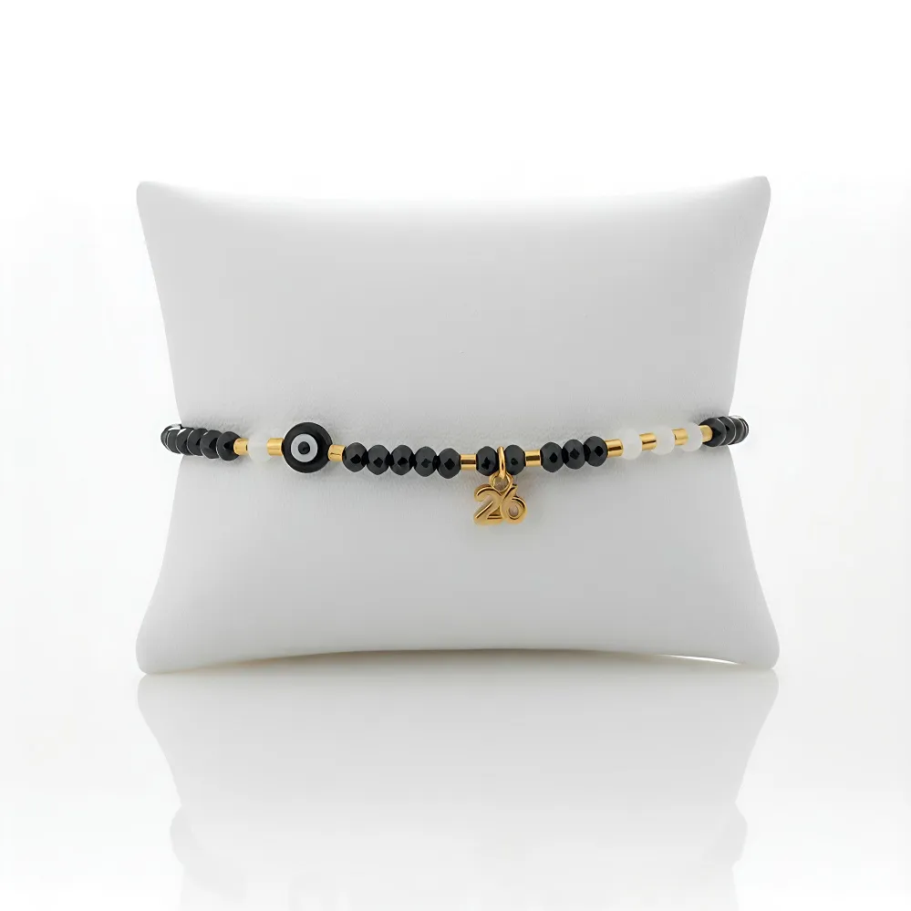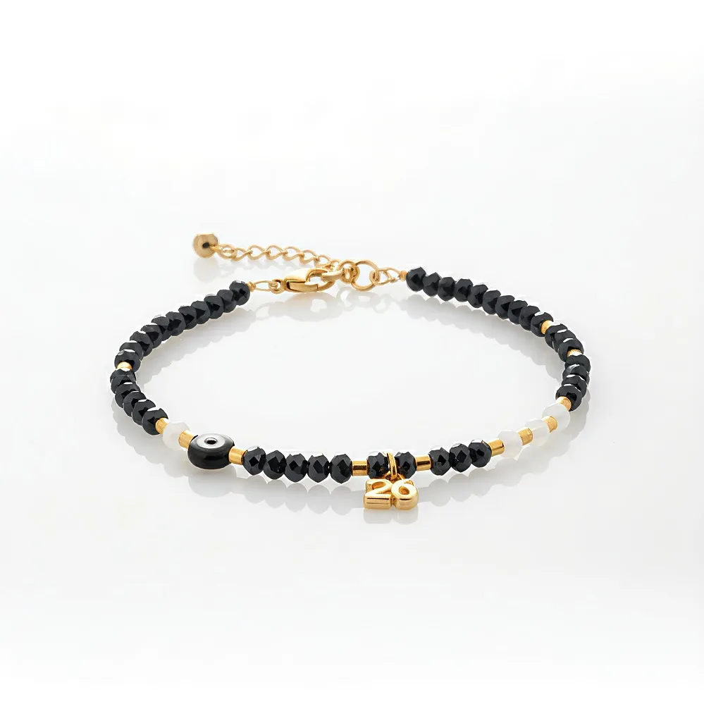 Η λεπτή, χειροποίητη κατασκευή αγκαλιάζει τον καρπό σας με διακριτική λάμψη. Κάθε βραχιόλι διαθέτει ένα εντυπωσιακό γούρι με τον αριθμό "26" και ένα προστατευτικό ματάκι, συνδυάζοντας την κομψότητα με τη σημασία.