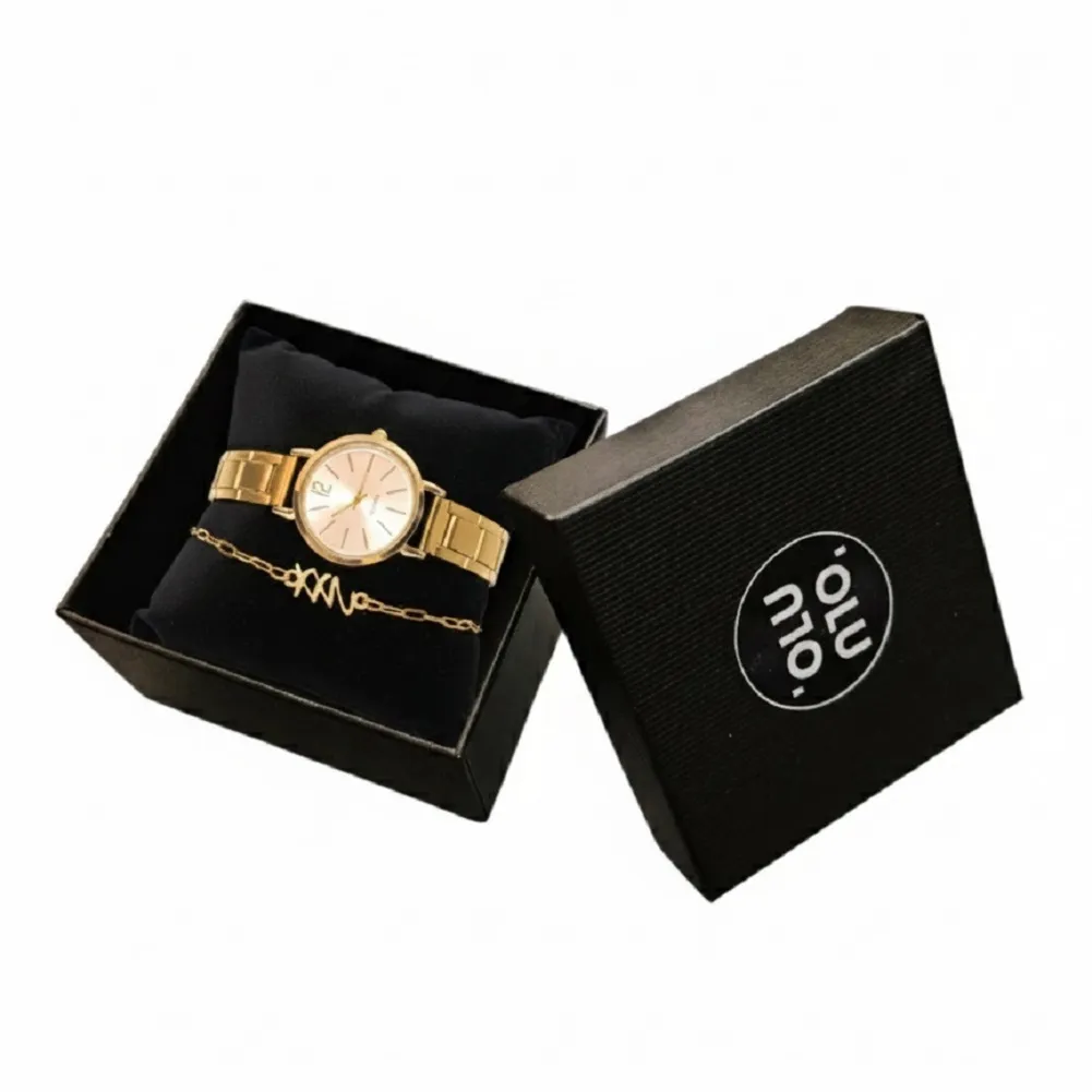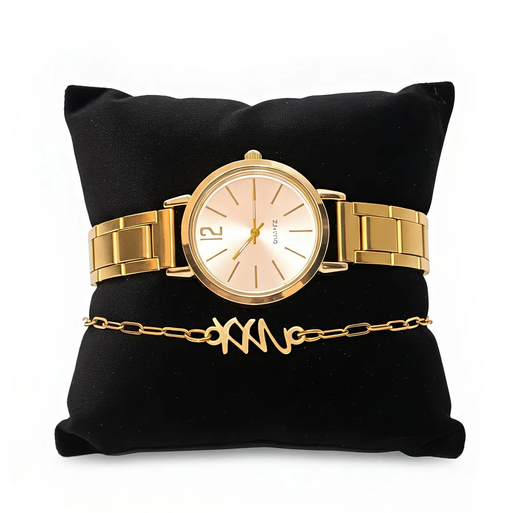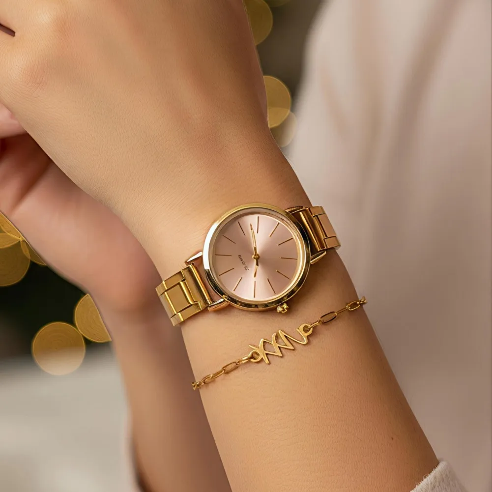 Κομψό Ατσάλινο Ρολόι: Με χρυσό μπρασελέ και λιτό καντράν σε απαλή ροζ-χρυσή απόχρωση, το ρολόι είναι κατασκευασμένο από ανθεκτικό ανοξείδωτο ατσάλι για να διαρκέσει στο χρόνο. Η μίνιμαλ σχεδίασή του το καθιστά ιδανικό για κάθε εμφάνιση, από το πρωί έως το βράδυ.