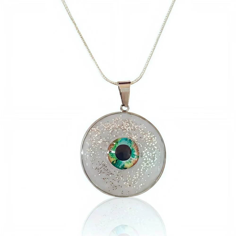 Φιλοξενεί ένα πολύχρωμο μάτι, περιτριγυρισμένο από λαμπερό glitter, σφραγισμένο κάτω από Υγρό Γυαλί (ρητίνη) για κρυστάλλινη όψη και λάμψη.