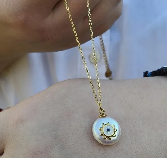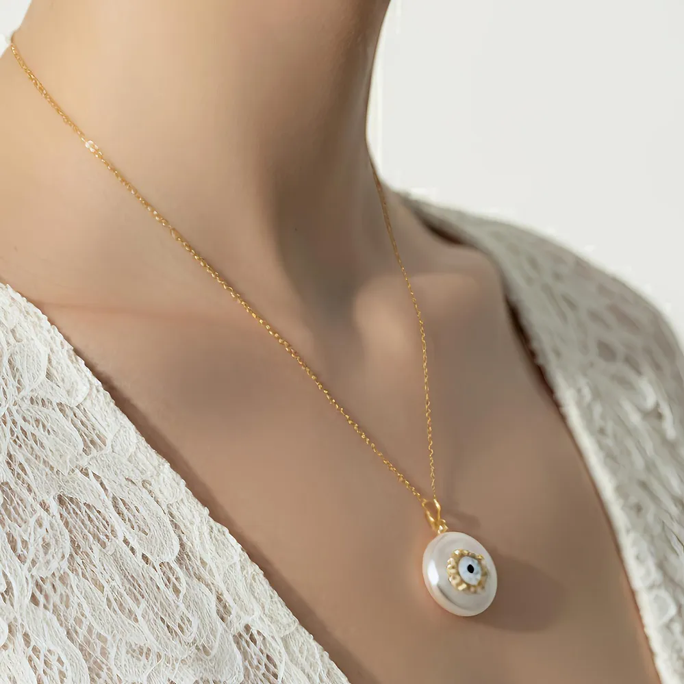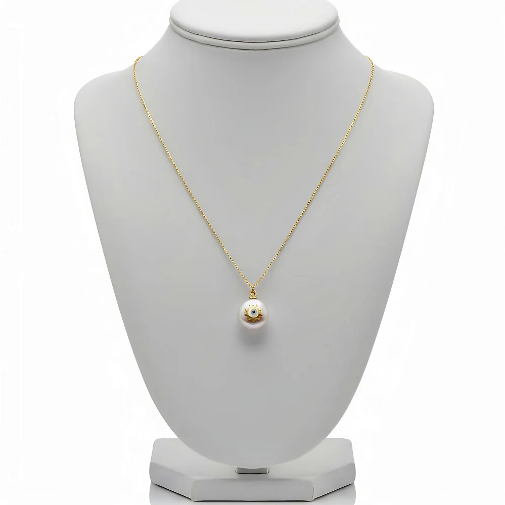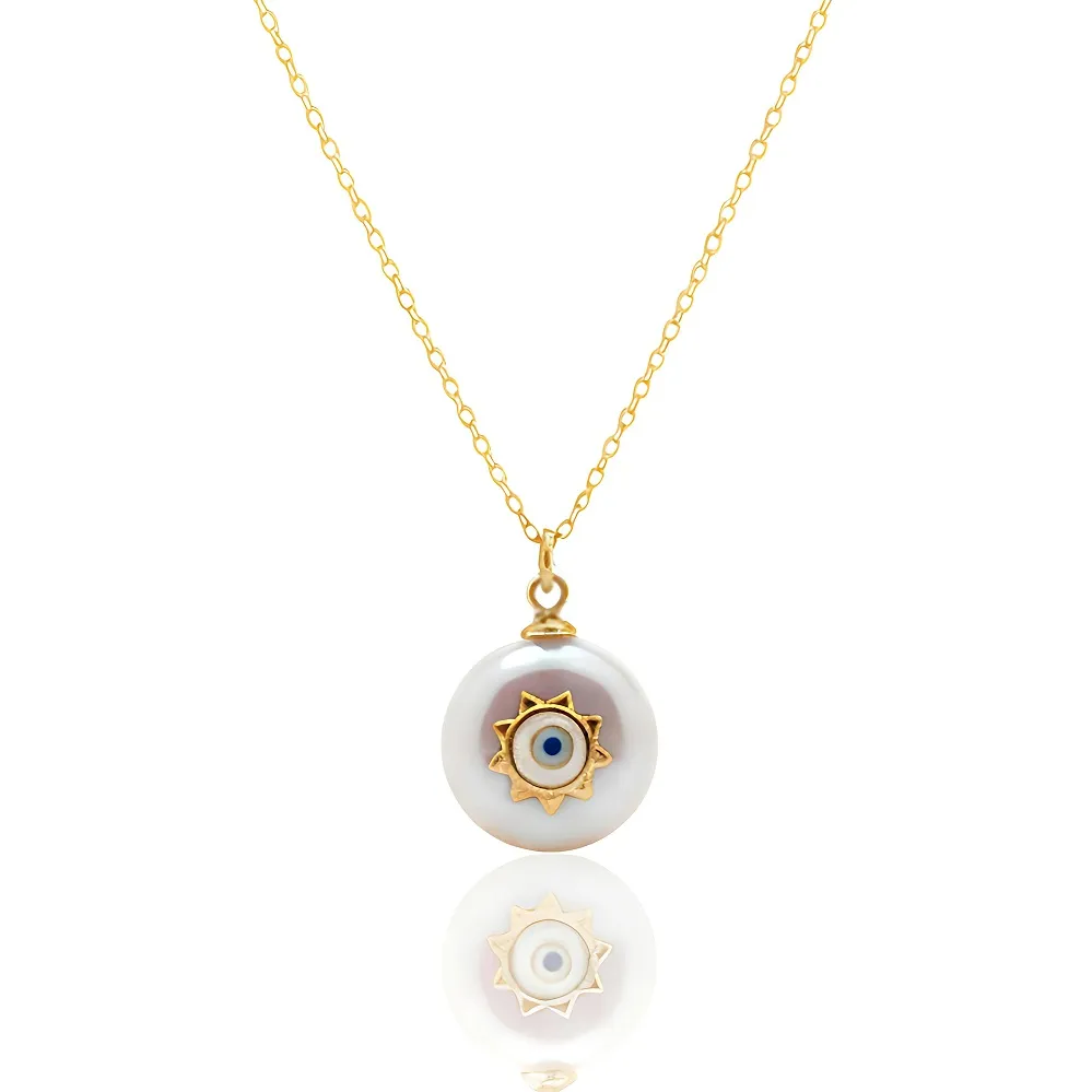 Αυτό το κομψό μενταγιόν είναι φτιαγμένο από ένα πανέμορφο μαργαριτάρι, διακοσμημένο με ένα διακριτικό χρυσό μάτι για προστασία και στυλ.