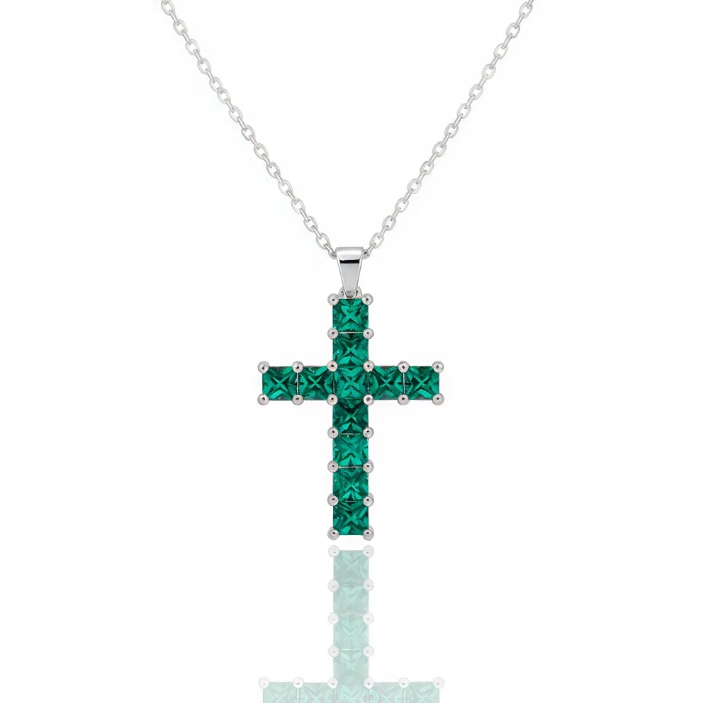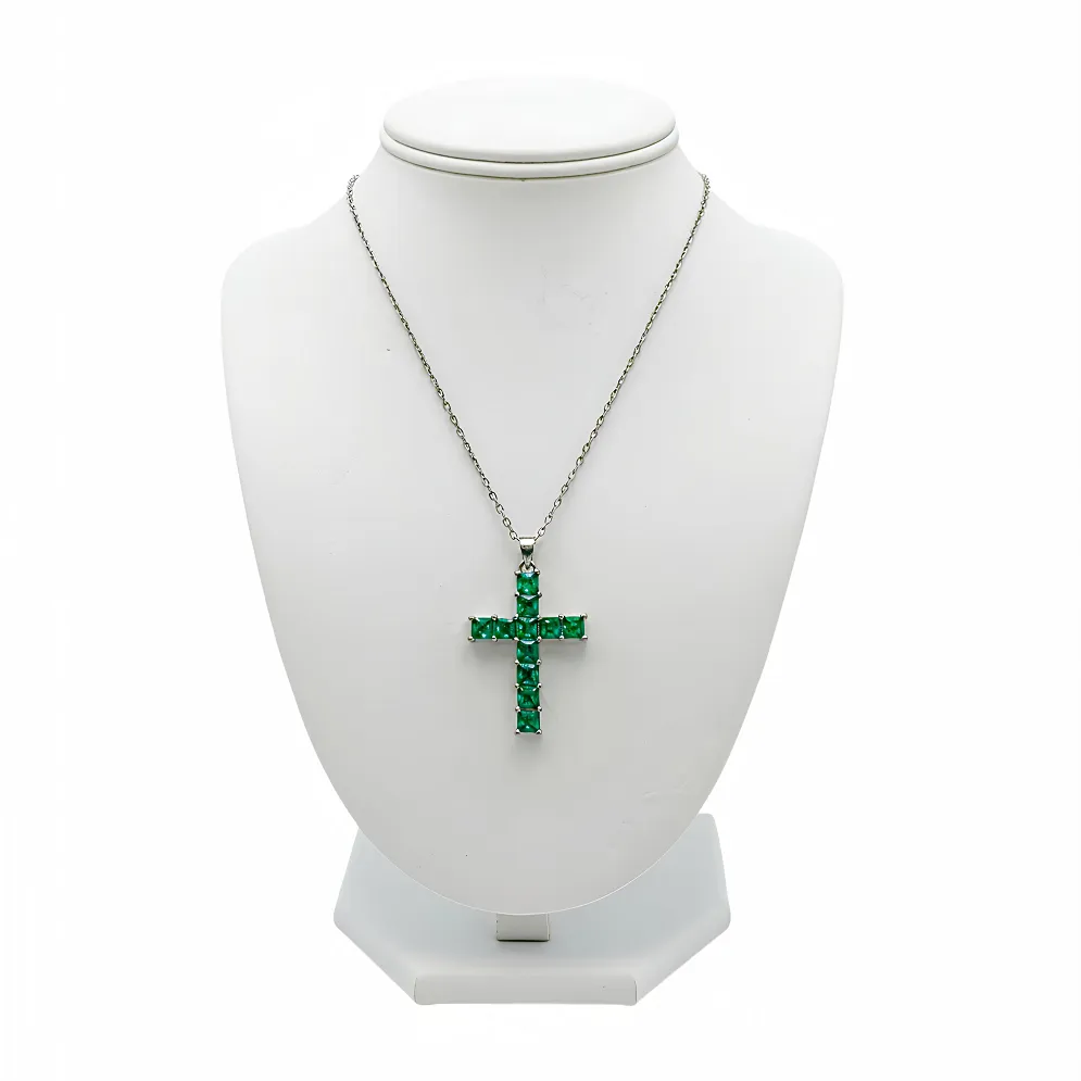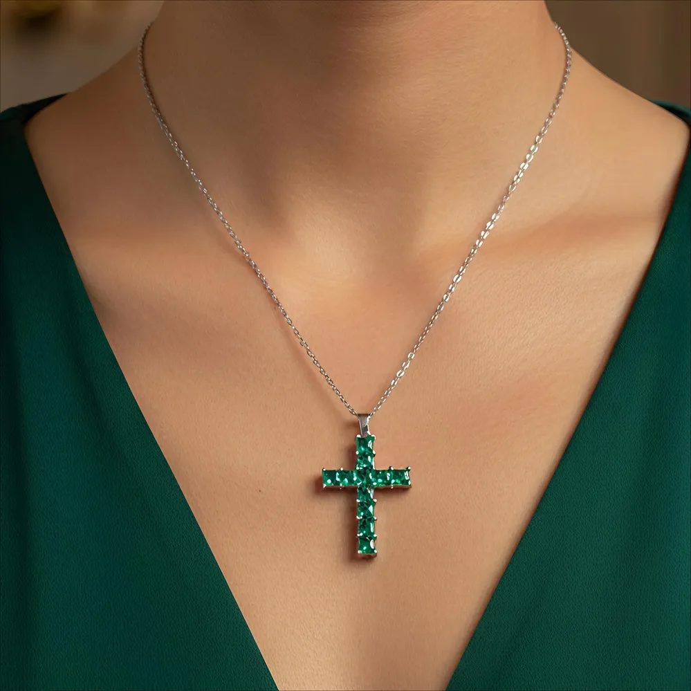 Αναδείξτε το στυλ σας με αυτόν τον εντυπωσιακό σταυρό, ένα κόσμημα που συνδυάζει την ανθεκτικότητα του ασημί ατσαλιού με την εκθαμβωτική λάμψη των πράσινων κρυστάλλων.