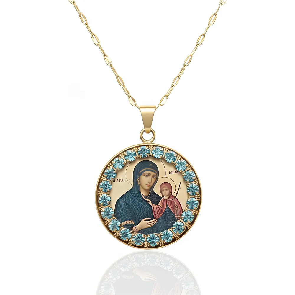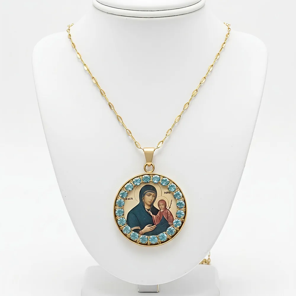 Το σχέδιο της Αγίας Άννας είναι τοποθετημένο σε ένα εντυπωσιακό πλαίσιο με μπλε ζιργκόν, δημιουργώντας ένα κόσμημα με βαθιά σημασία και εξαιρετική ομορφιά.