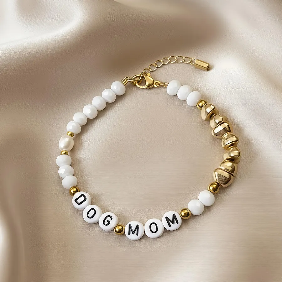 Χειροποίητο βραχιόλι Dog Mom σχεδιασμένο για γυναίκες που αγαπούν τα σκυλιά και θέλουν να το εκφράζουν μέσα από το κόσμημά τους. Διαθέτει λευκά κρύσταλλα τύπου μαργαριτάρι και ακρυλικά στοιχεία με την επιγραφή Dog Mom προσφέροντας κομψή και μοντέρνα αισθητική