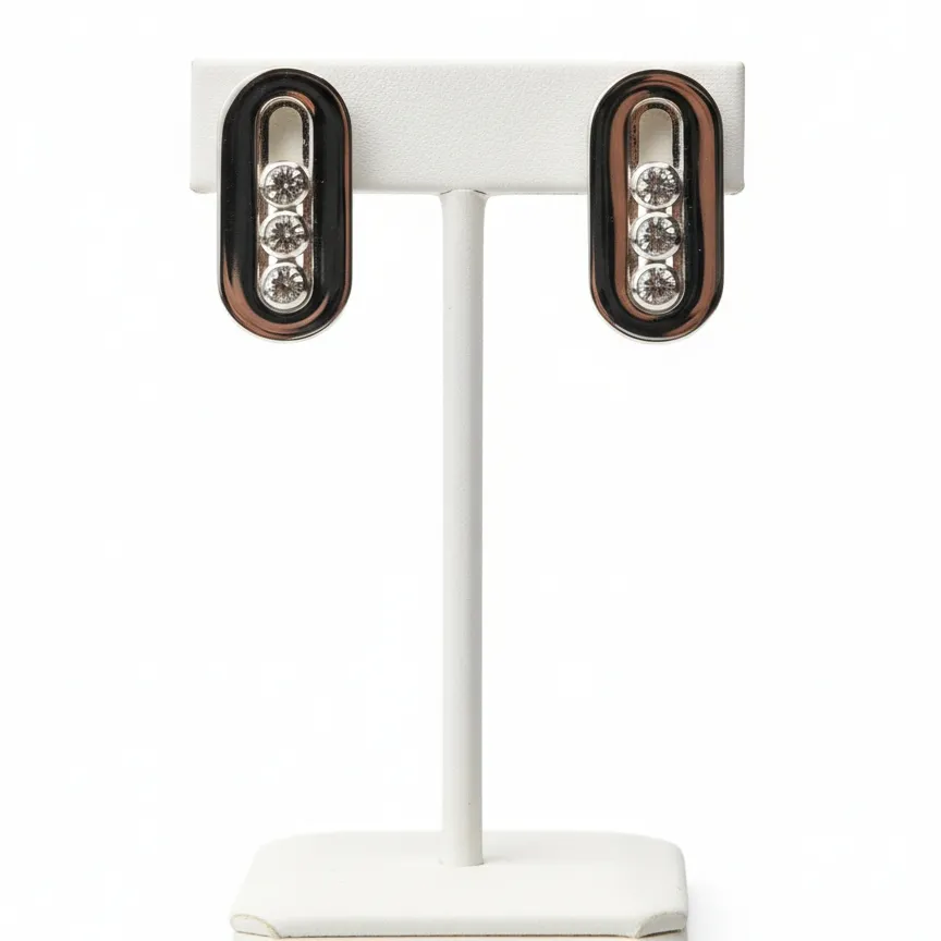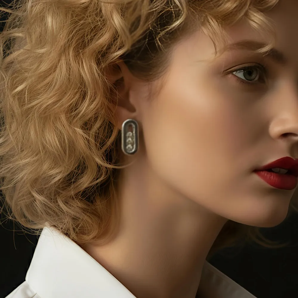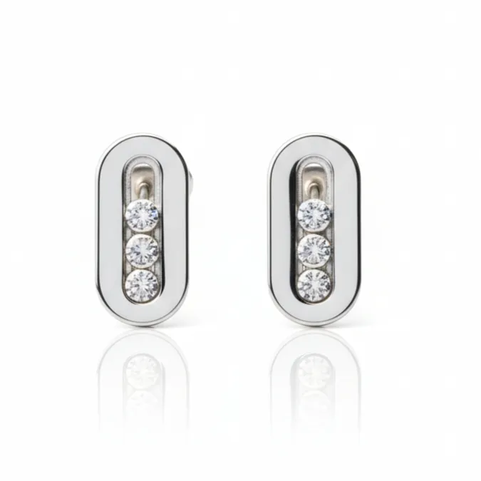 Σκουλαρίκια που συνδυάζουν την κομψότητα του ανοξείδωτου ατσαλιού με την κίνηση τριών κινούμενων, διάφανων χαντρών στρας, προσφέροντας ένα μοναδικό οπτικό εφέ.