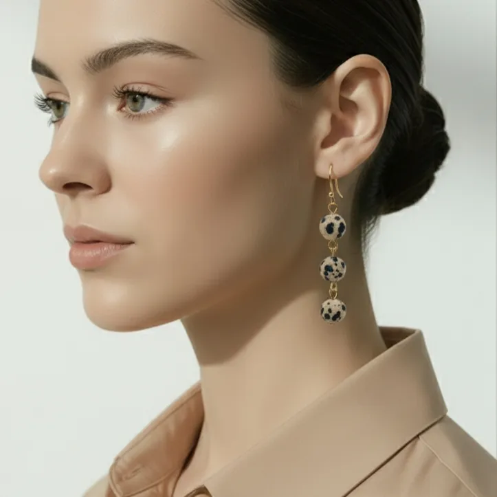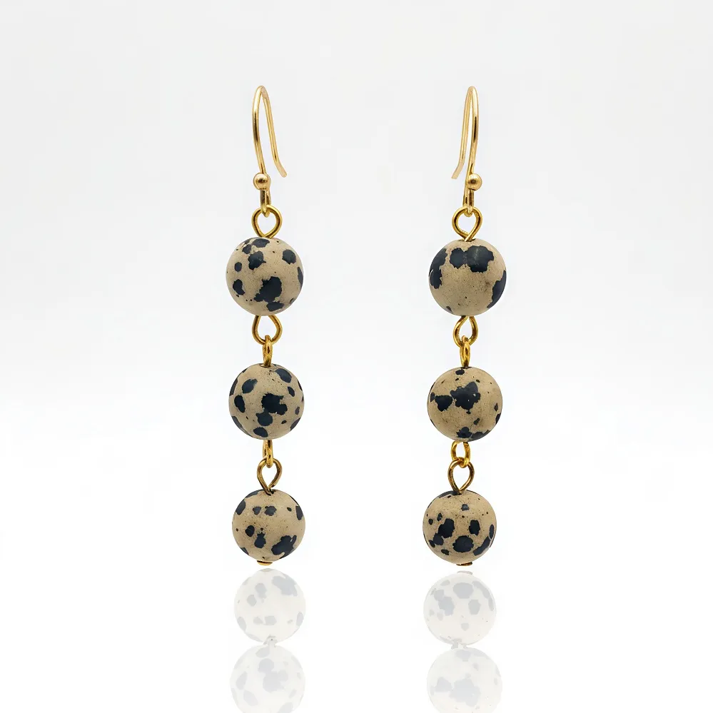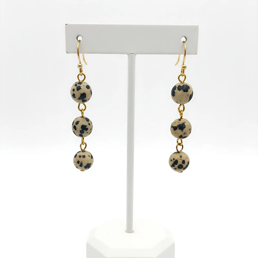 Σκουλαρίκια χειροποίητα από Ίασπι Δαλματίας με τρεις κρεμαστές χάντρες σε κάθε κομμάτι.