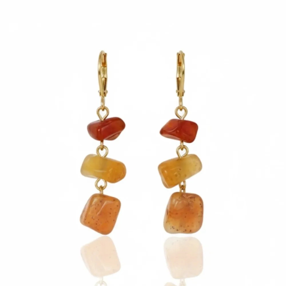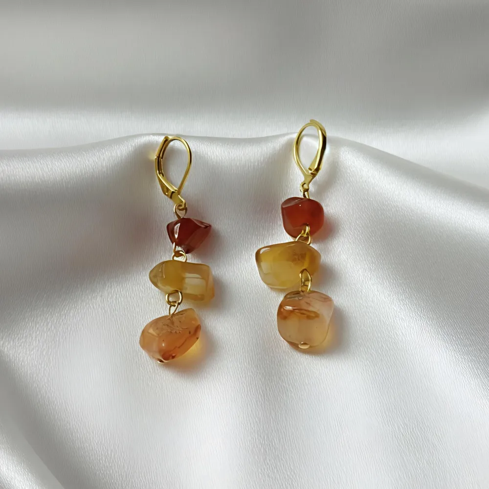 Εντυπωσιακά κρεμαστά σκουλαρίκια, μήκους 4 εκατοστών, διακοσμημένα με ακανόνιστες πέτρες κορνεόλης σε ζεστούς κεχριμπαρένιους τόνους.