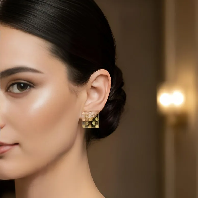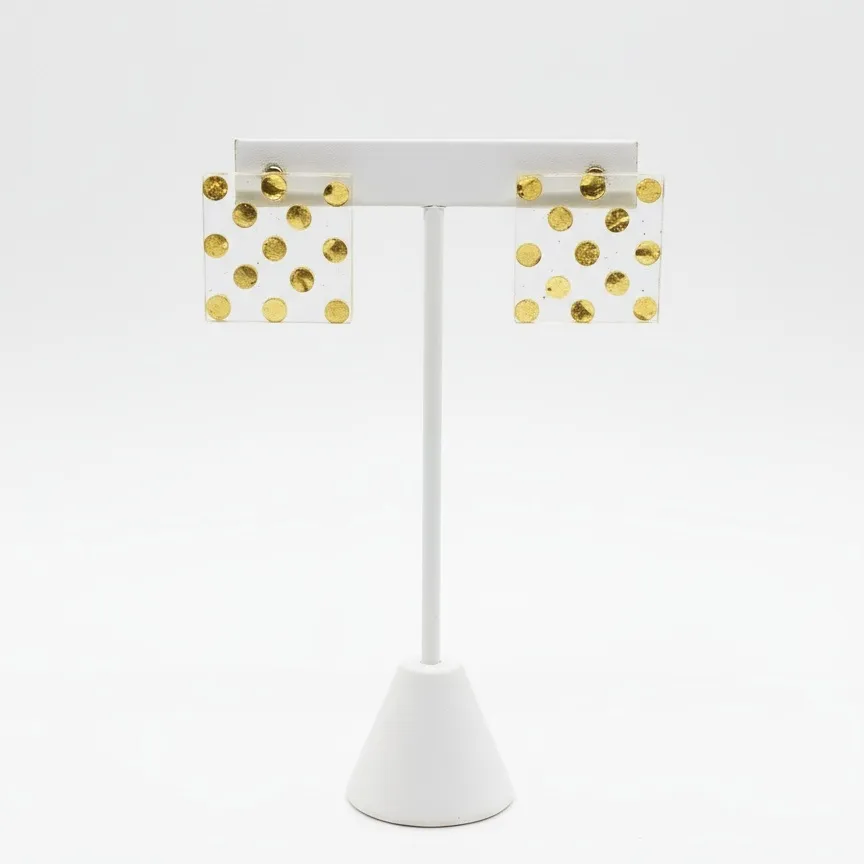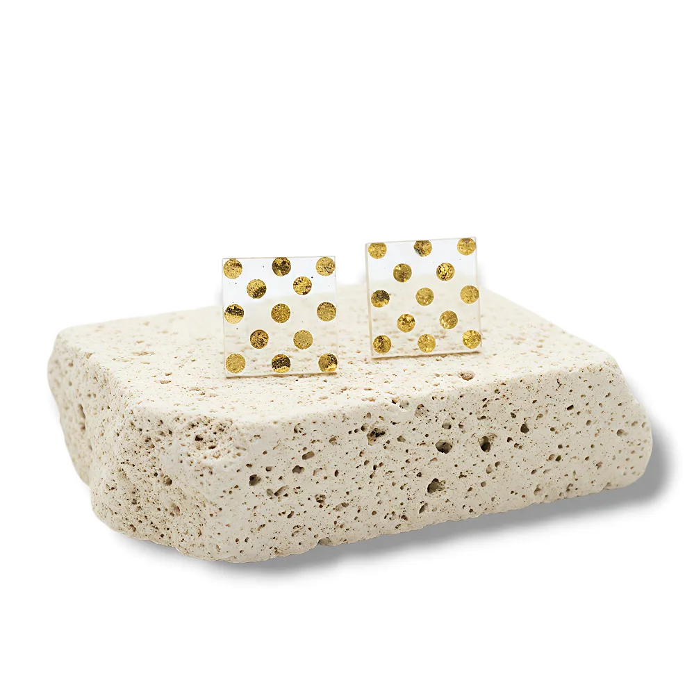 Αναδείξτε το στυλ σας με αυτά τα μοναδικά χειροποίητα τετράγωνα διάφανα σκουλαρίκια με πουά σχέδιο από φύλλο χρυσού.