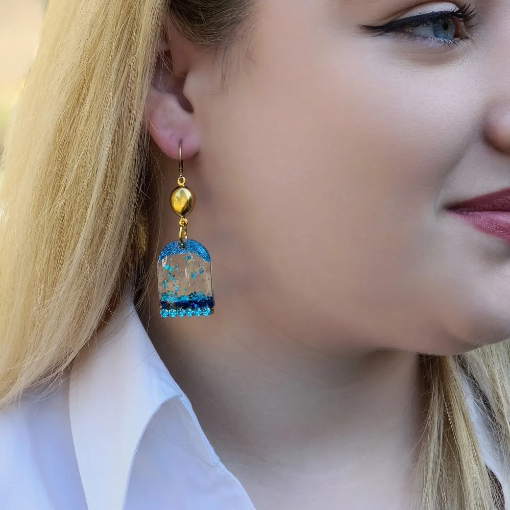 Λαμπερά χειροποίητα σκουλαρίκια από υγρό γυαλί με μπλε γκλίτερ και στρας, σε υποαλλεργικό ατσάλι ,κομψά, ανθεκτικά και μοναδικά όπως εσύ.
