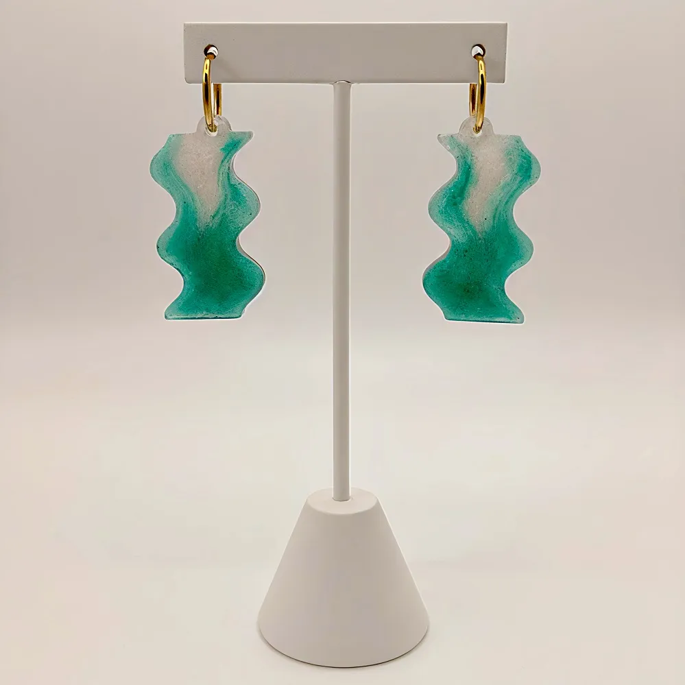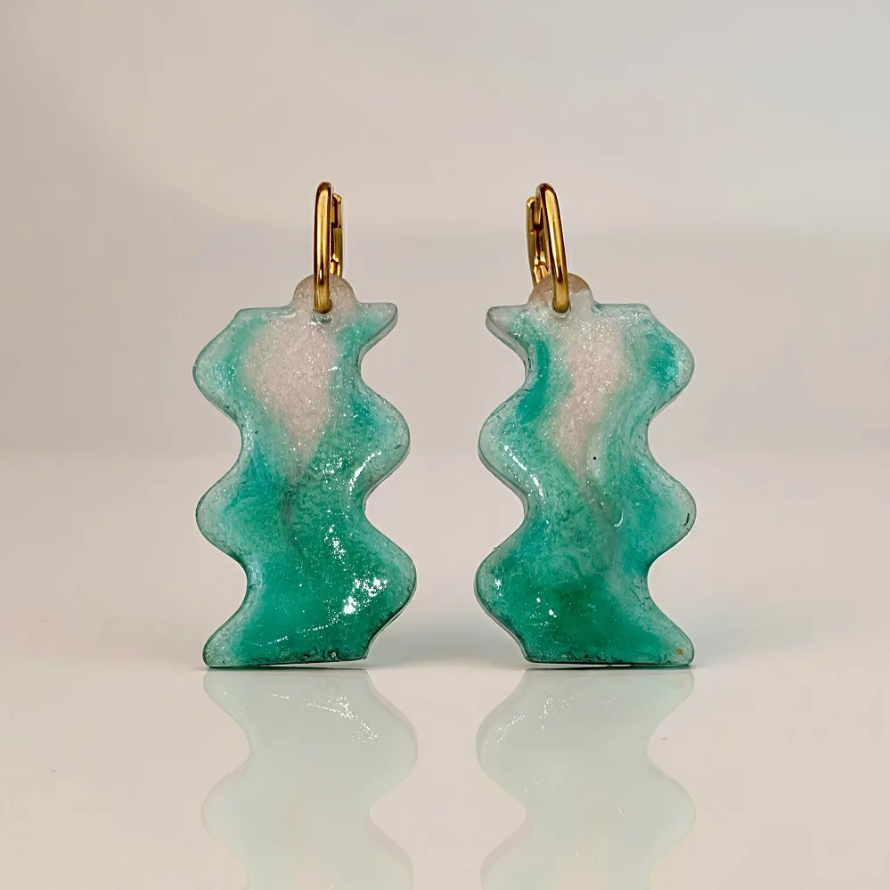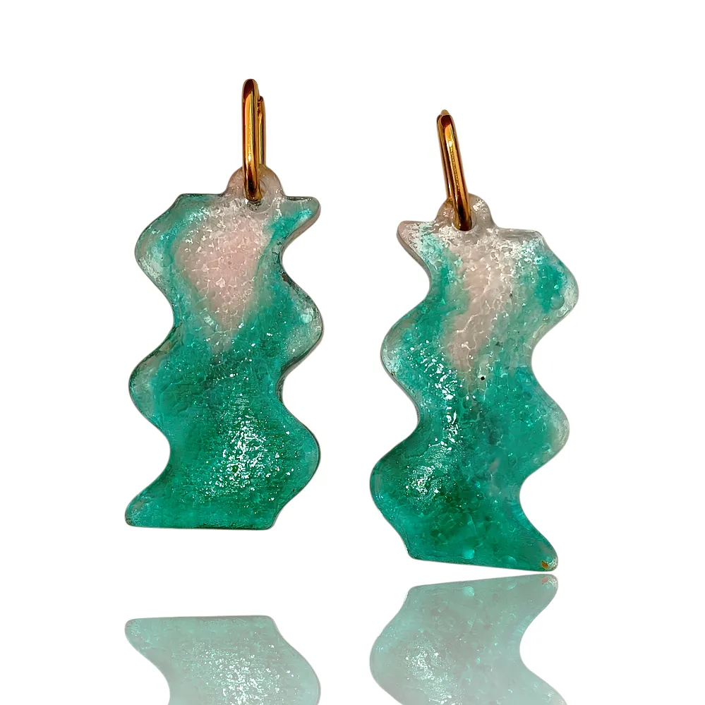 Χειροποίητα σκουλαρίκια από υγρό γυαλί σε βαθύ πράσινο χρώμα, με εντυπωσιακή σαγρέ επιφάνεια που παίζει με το φως.