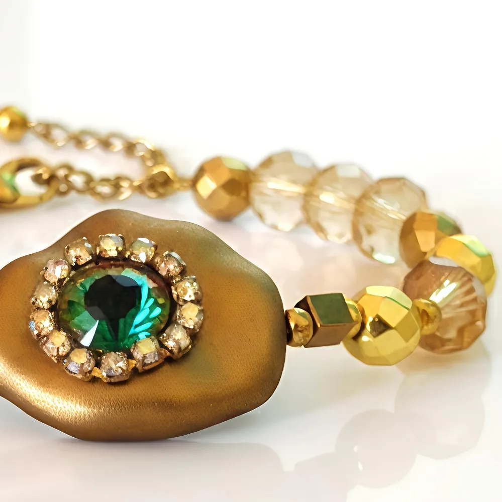 Κομψό και ανθεκτικό χειροποίητο βραχιόλι από ατσάλι με χάντρες αιματίτη και σαμπανιζέ κρυστάλλους.