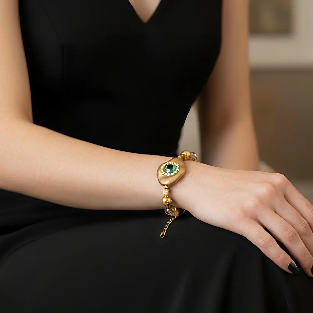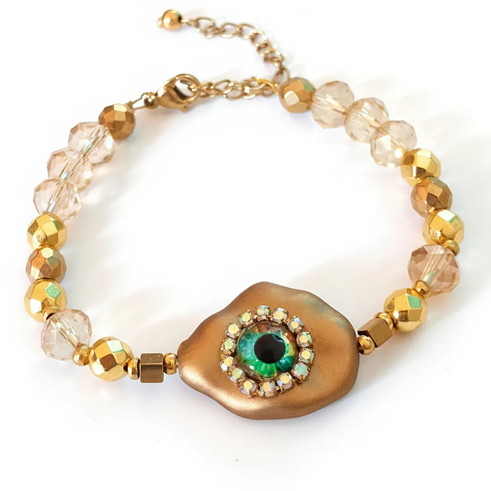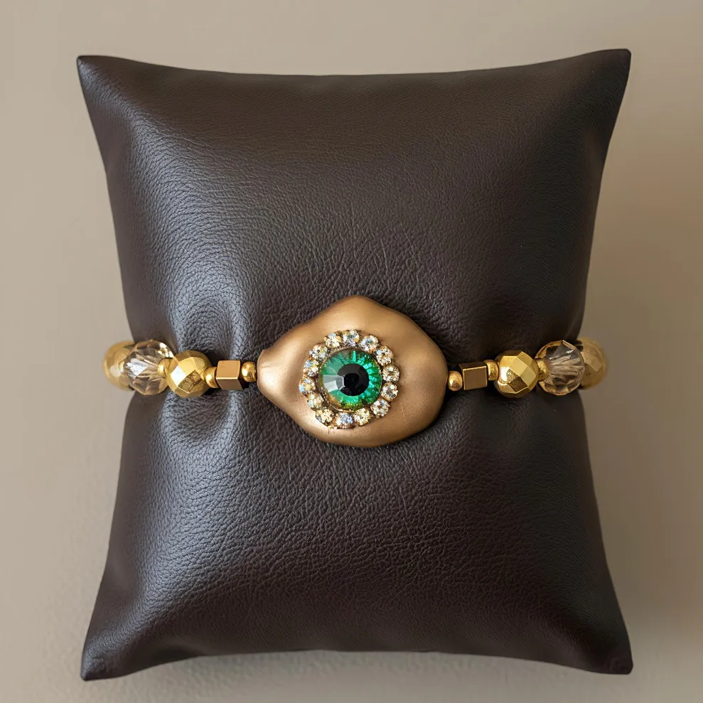 Το βραχιόλι που δεν λείπει ποτέ από το στυλ σου: ατσάλι ανθεκτικό, λαμπερά κρυσταλλάκια και ένα εντυπωσιακό χρυσό ματάκι με στρας για extra λάμψη και θετική ενέργεια.
