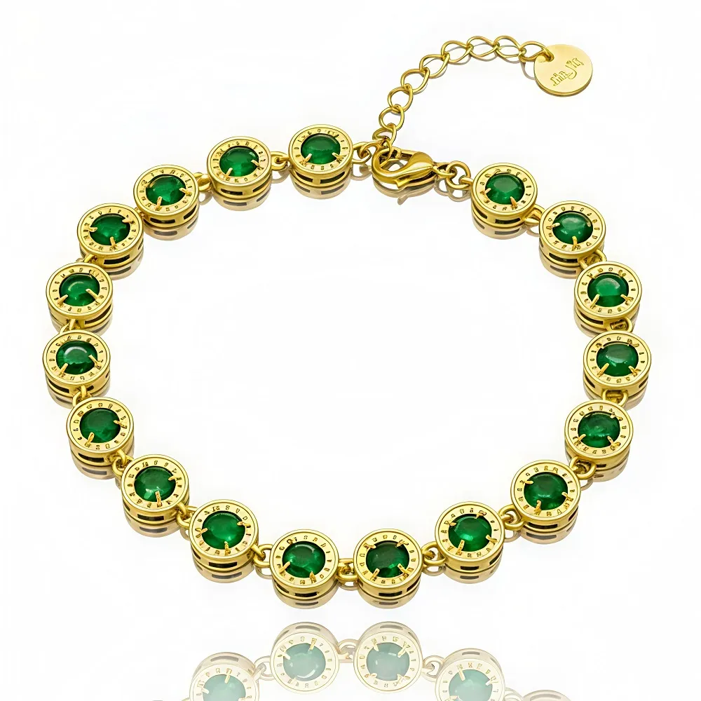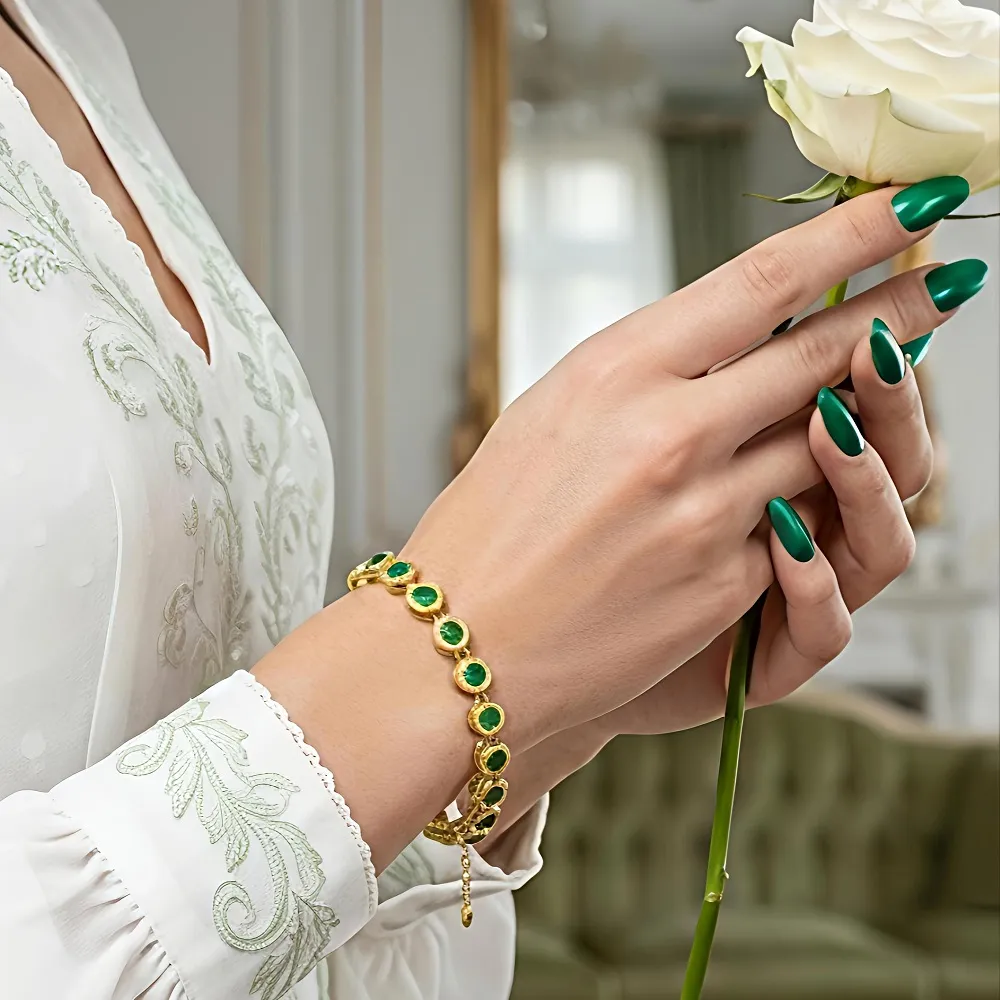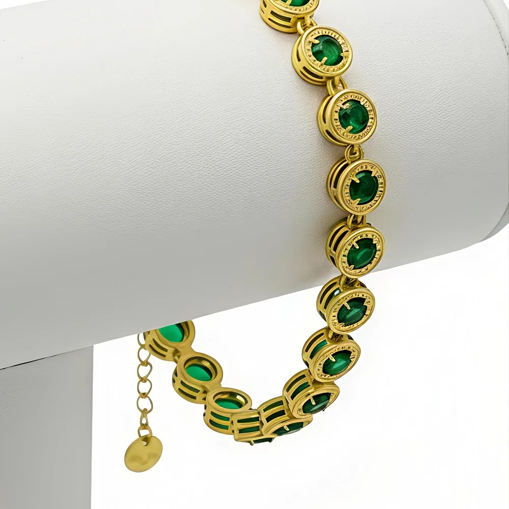 Ένα κομψό βραχιόλι από υψηλής ποιότητας ανοξείδωτο ατσάλι, διακοσμημένο με λαμπερά πράσινα κρύσταλλα στο κέντρο κάθε στοιχείου.