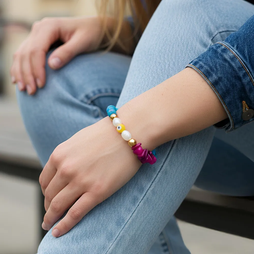 Ανθεκτικό και κομψό βραχιόλι από ατσάλι με πολύχρωμα στοιχεία και ρυθμιζόμενο μέγεθος.