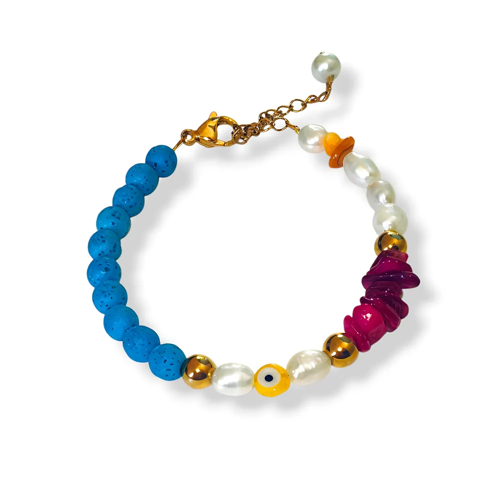 Κομψό και ανθεκτικό βραχιόλι από ατσάλι που δεν μαυρίζει με το χρόνο, διακοσμημένο με αιματίτη, μπλε λάβα, μαργαριτάρια και κοράλλι.